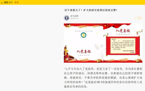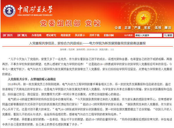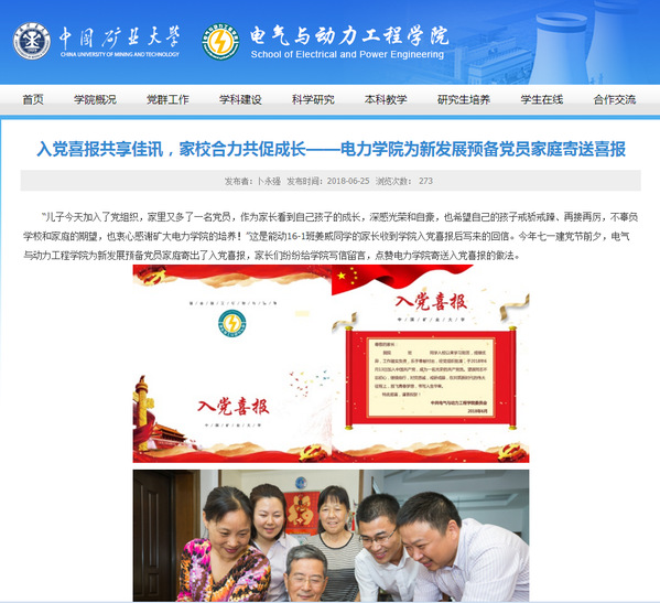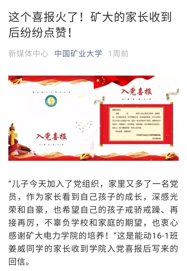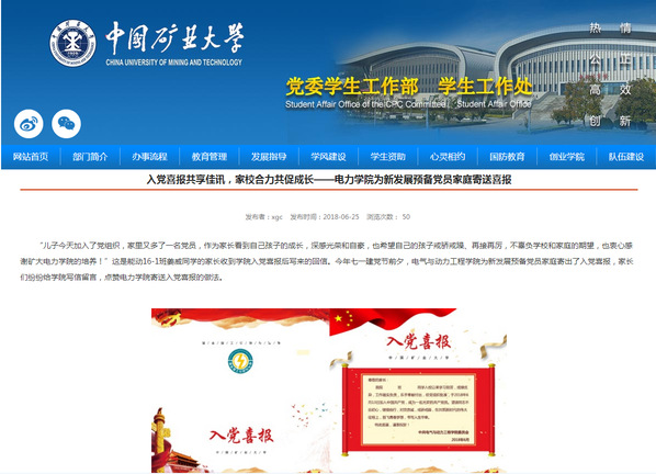 2018年6月,新一批发展预备党员工作刚刚结束,电气与动力工程做爱直播 就着手筹备相关工作,将一封封党员发展喜报和信函装进信封,通过快递寄给了天南地北的学生家长,与学生家长共享这份喜悦与荣耀。家长在收到喜报和信函后,纷纷通过信件、微信留言、朋友圈等方式第一时间分享这份喜悦,点赞这份细致暖心的做法。