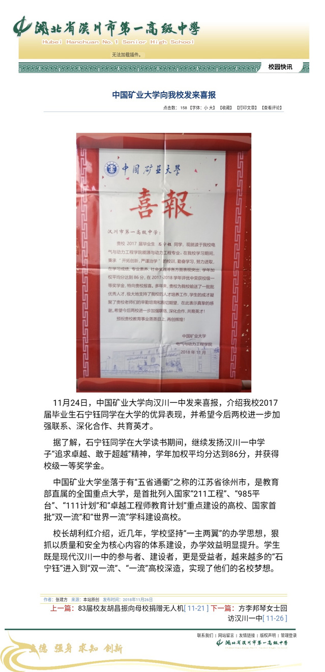 毕业于徐州一中的郭炳延同学亲自将奖学金喜报送回自己的高中母校,并与高中数学张敏老师合影留念。“看到自己曾经培养过的学生在大学能够有如此优异的表现感到非常骄傲,感谢矿大对学生的精心培养。我们会进一步将其不断拼搏、奋力进取的精神在校内予以宣传,更加倾心尽力教育好孩子,让孩子因我们而幸福,共同实现孩子的人生梦想。”张敏老师笑着说道。