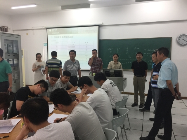 交流结束后,在基地领导的陪同下一行人来到实训基地现场,对正在进行实习的电气专业14级学生进行慰问。郭楚文院长和许宏志副书记来到同学中间亲切慰问同学们的实习生活,同时鼓励同学们在实习过程中认真实践,提高动手能力,徐瑞东副院长、邓先明教授与梁睿教授还向同学们教授了如何辨别高低压组的方式等一些实用技能。
