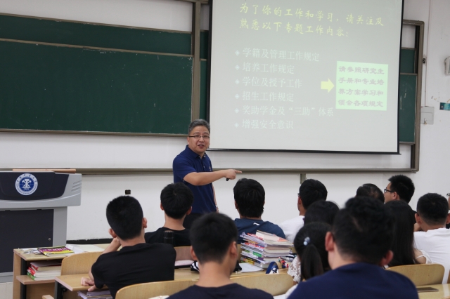 科研、研究生副院长韩东太主持报告会并为全体研究生新生做了入学教育报告。