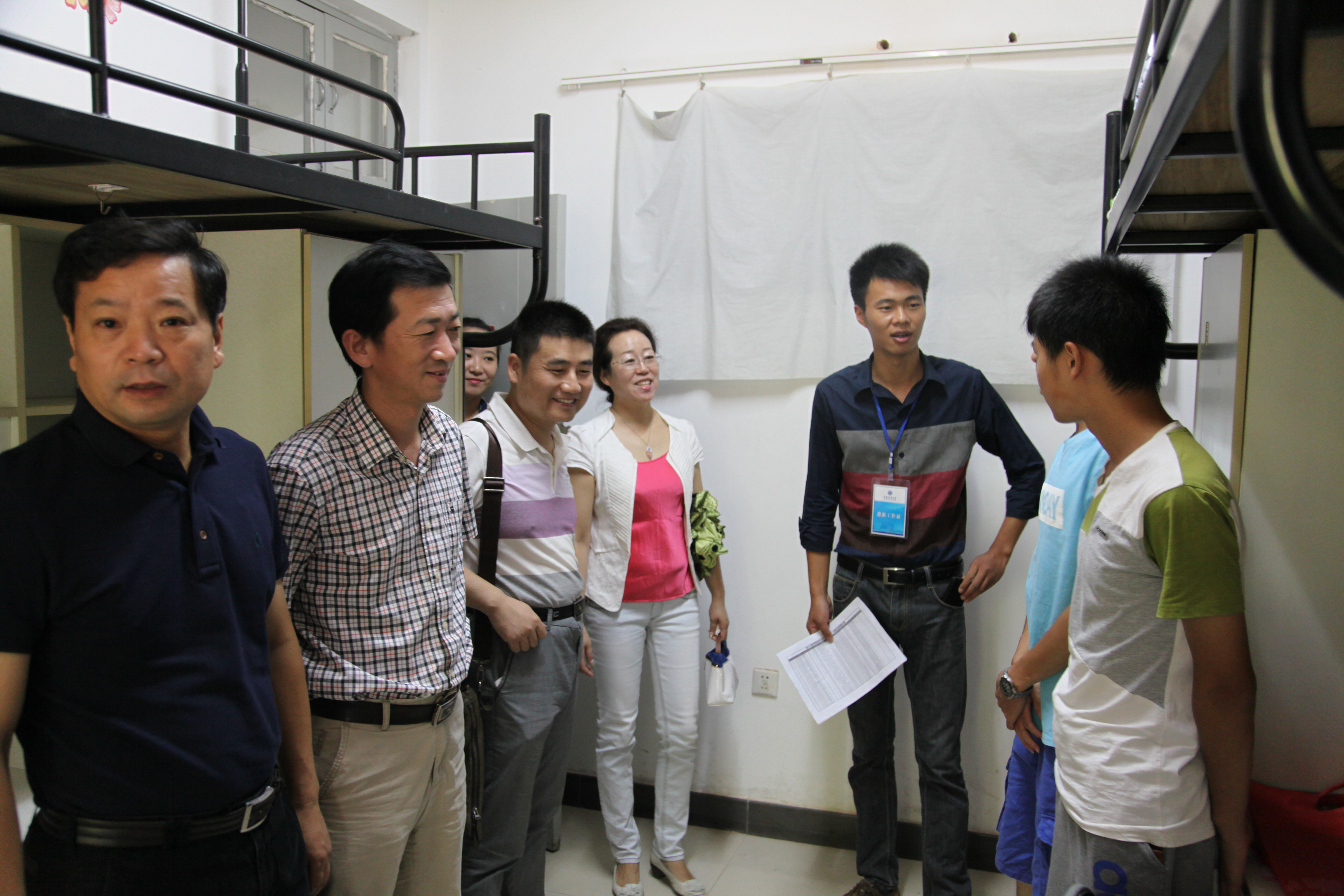 领导一行来到新生的宿舍,陈清华书记从门、窗、床铺、浴室、电器、墙壁、边角…每个角落都察看得很仔细,并对学生宿舍的住宿条件表示肯定。张磊副书记就迎新期间宿舍管理、新生家长住宿等问题进行了详细的了解,对做爱直播