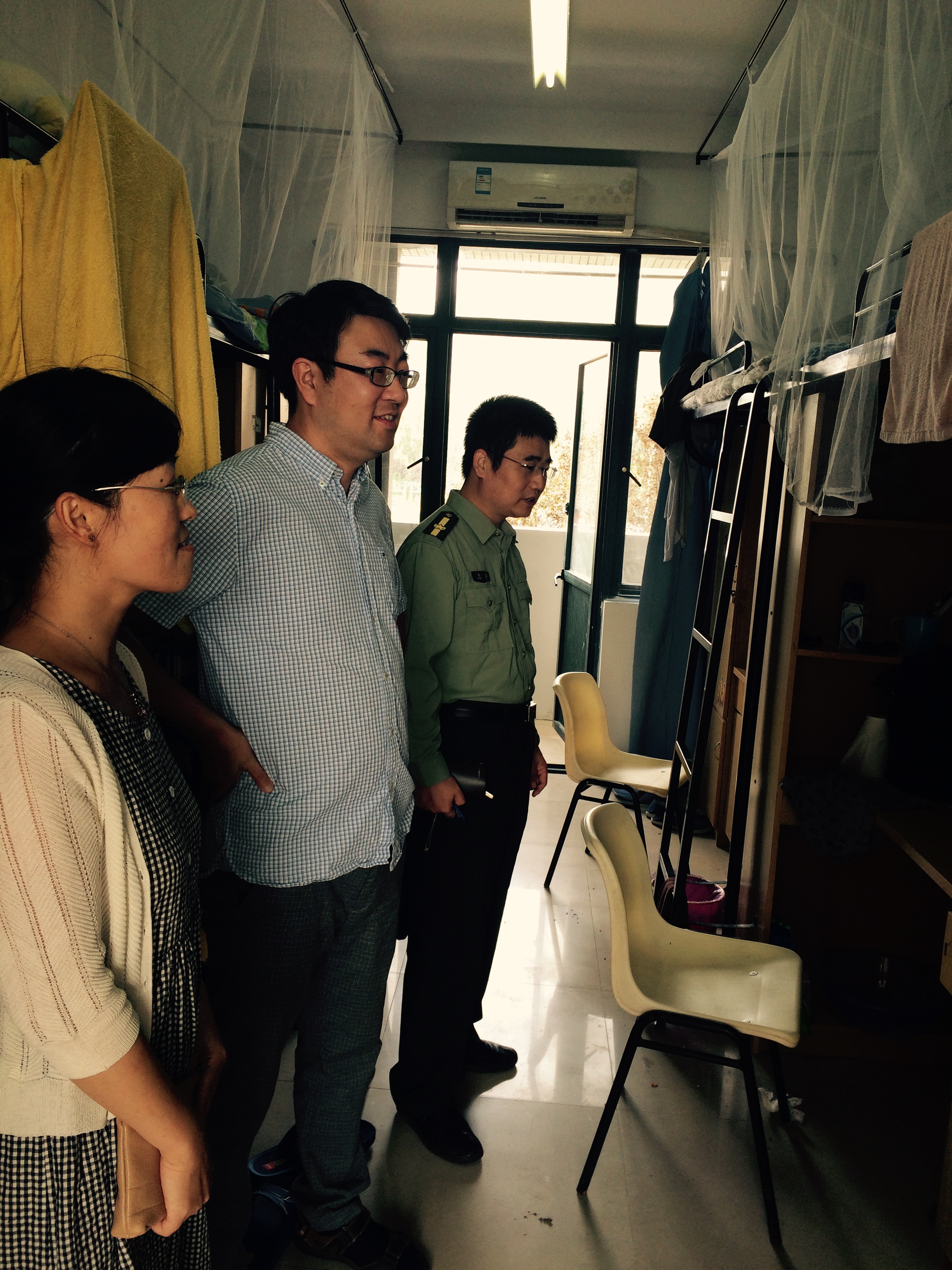 相关领导对研究生宿舍进行了安全检查。具体要求根据《关于进一步加强学生安全教育和学生宿舍安全管理的通知》中的四个“禁止”加强宿舍管理工作:1、严禁使用和存放热得快、电炉、电磁炉、电饭锅、电热锅、电热壶、电热杯、电取暖器、电熨斗、电热毯等电加热器具;严禁私拉乱接电气线路;严禁使用明火及存放煤气灶具、煤油炉、酒精炉、蜡烛等用具;严禁充电器无人看护充电;严禁使用或存放易燃易爆物品、危险化学品;严禁在宿舍内存放各类管制刀具。2、严禁在学生宿舍、宿舍阳台、宿舍走廊、消防通道、安全出口处堆放废纸、废塑料、饮料瓶、衣物等易燃物品;严禁在宿舍走廊、消防通道、安全出口处停放自行车、电动车。3、严禁在学生宿舍等建筑物内吸烟。4、严禁在学生宿舍内饲养宠物。