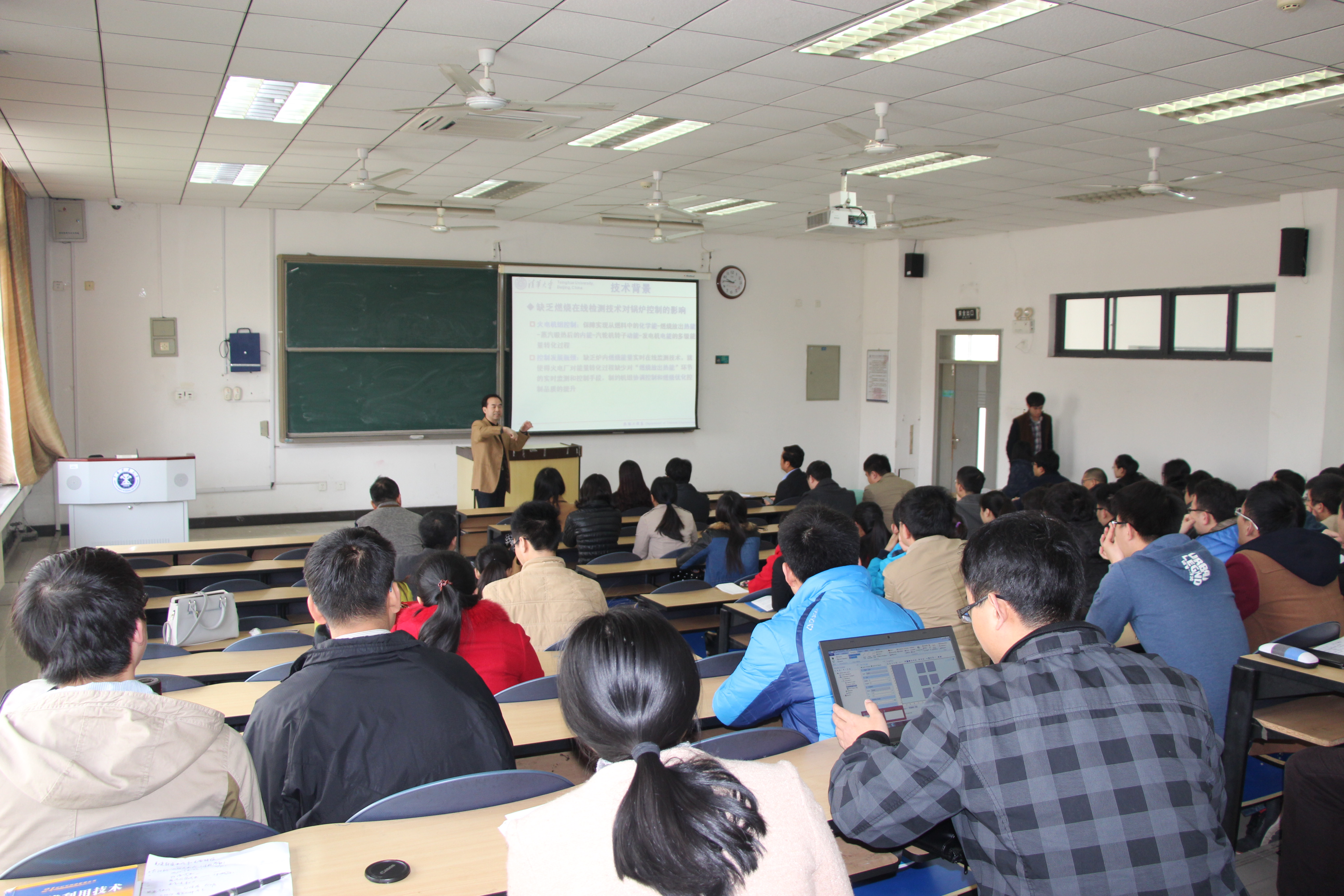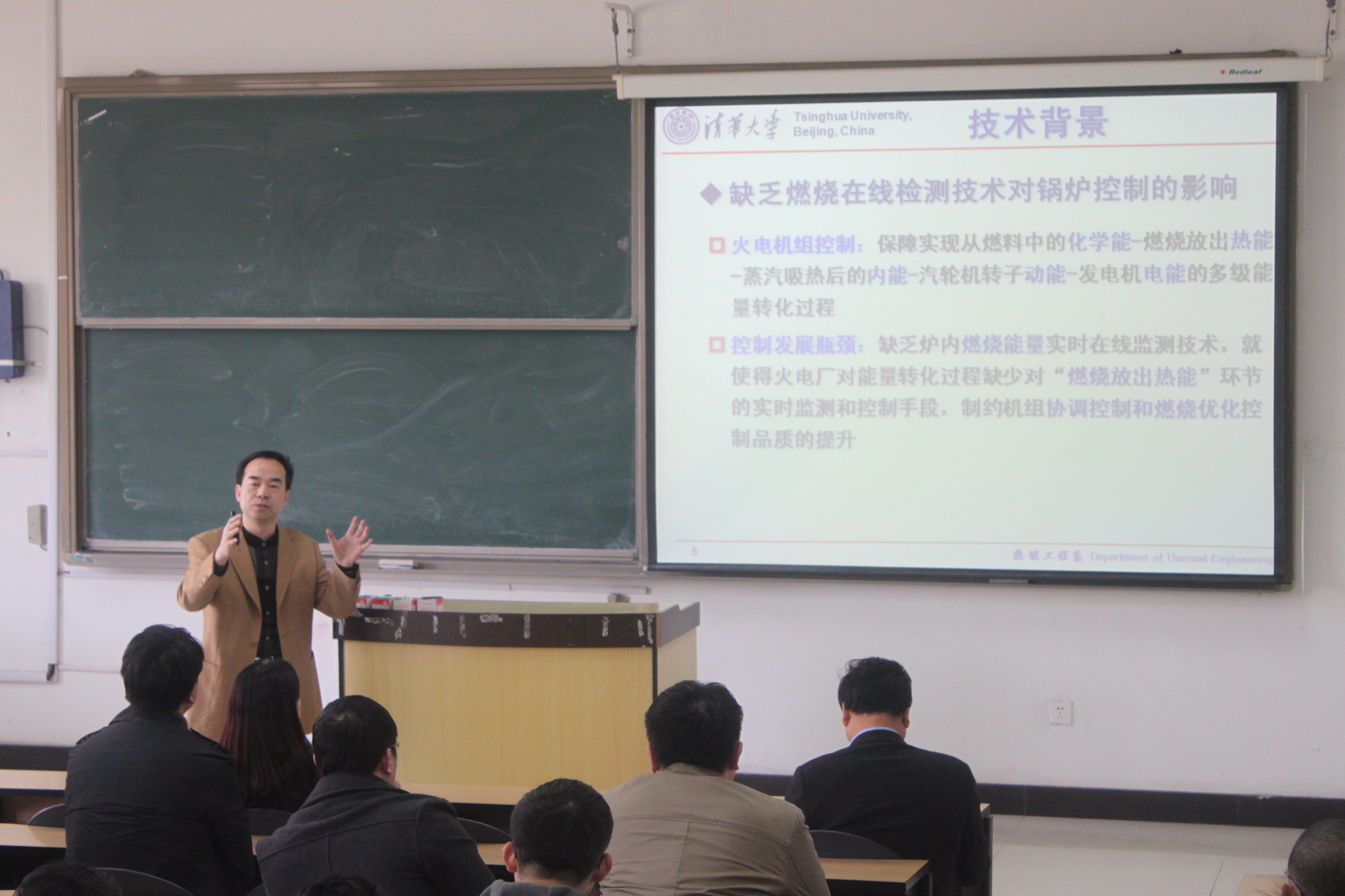 对周怀春教授的到来表示热烈欢迎。周怀春教授为同学们简单介绍了一下清华大学的热能工程系,在轻松的氛围中展开了报告会。周怀春教授针对当前的锅炉利用现状和研究背景,提出了一种有效改善燃烧的方案-燃烧在线监测技术,并介绍了燃烧系统的几个方面:湍流流动、化学反应、辐射传热。紧接着,周怀春教授从热辐射的角度详细介绍了炉内温度场的测量及控制方法-图像处理监控技术(三维温度场的实时监测)、线性规划法重建算法(二维温度场的实时监测),并将分析结果与实际数据对比。最后,周怀春教授指出利用辐射能控制和监测来确定最佳燃烧工况,确定最佳风量和氧量,使燃料燃烧的更充分,从而使锅炉达到更高的燃烧效率。