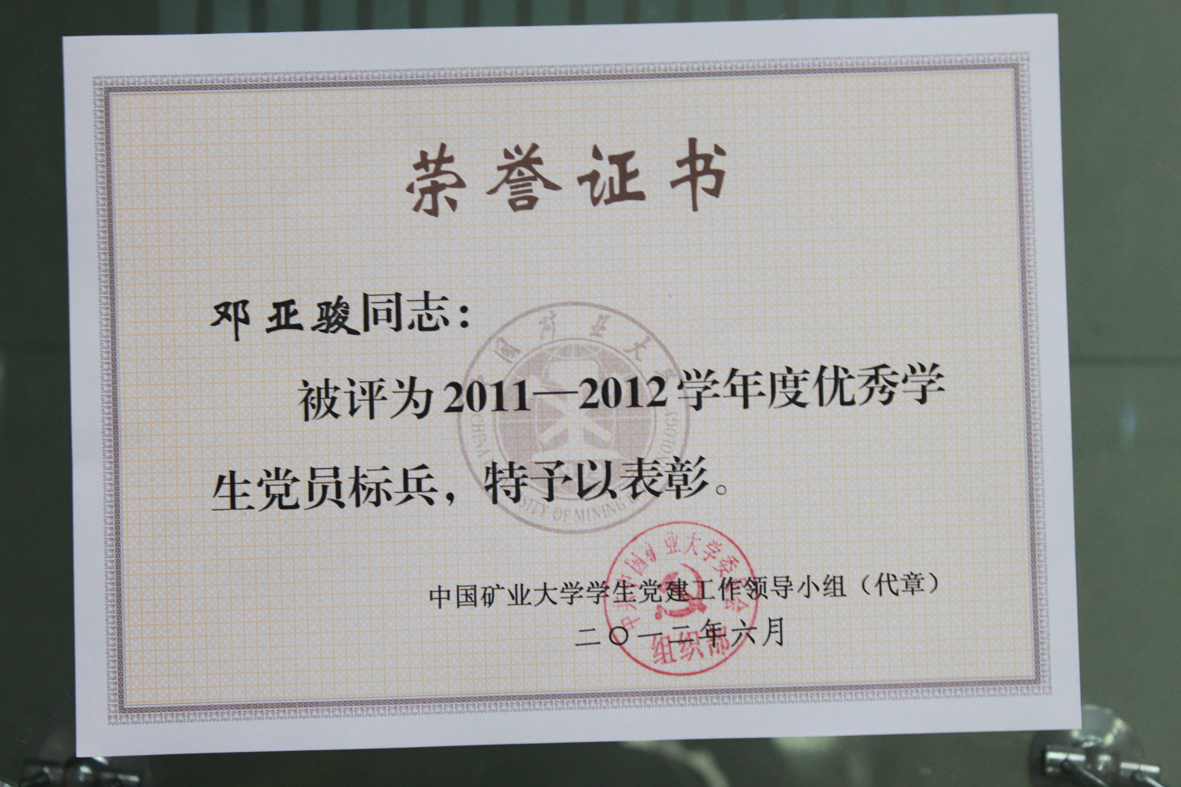 邓亚骏荣获2011-2012年度“优秀学生党员标兵”