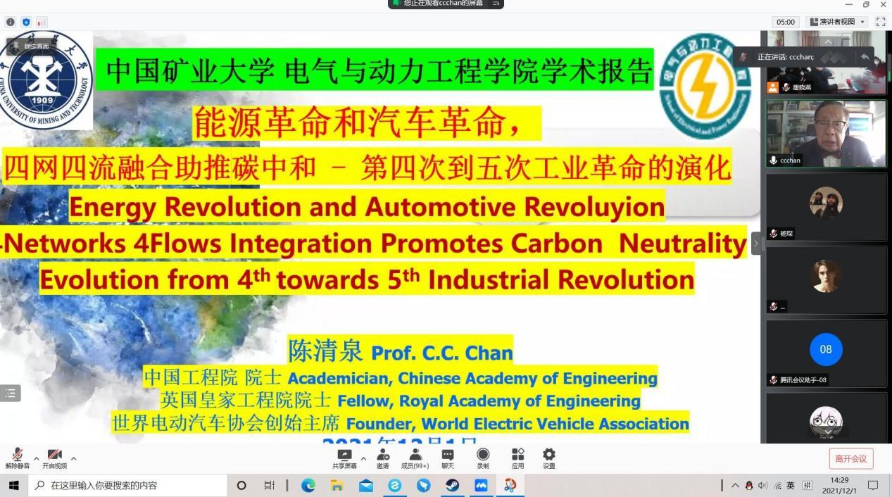 杰出校友陈清泉应邀作题为“能源革命和汽车革命,四网四流融合助推碳中和-第四次到第五次工业革命的演化”的学术报告,本次报告会由电力做爱直播