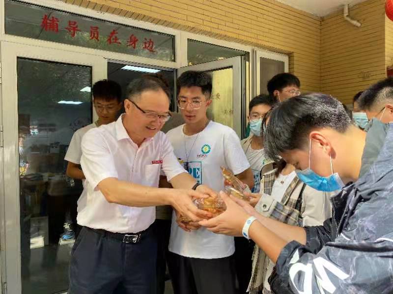 院党委书记伍小杰为新生发放月饼
