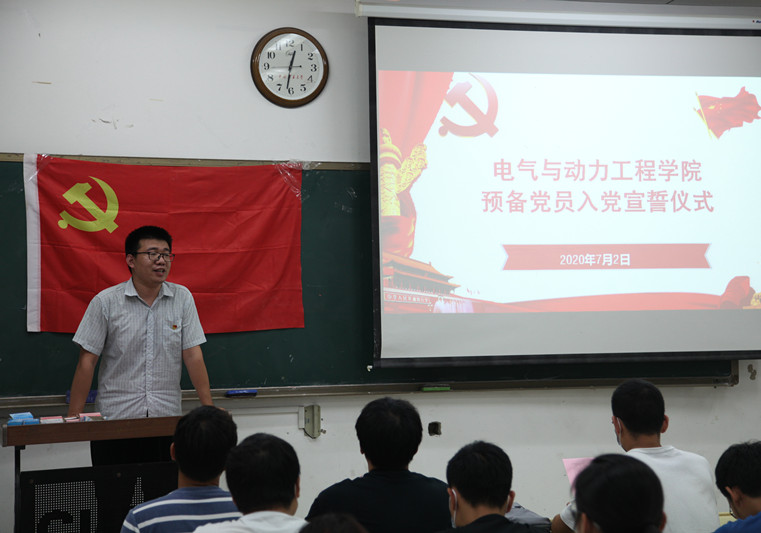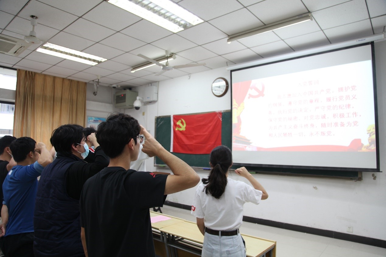 接下来,新党员代表进行领读宣誓,全体党员面向党旗,庄严宣誓。在党旗下,每一位新党员都表达出自己作为一名共产党员为共产主义事业奋斗终身的赤子之心。在场的老党员重温了入党誓词,牢记作为一名共产党员的职责与使命。宣誓完毕,郭凯强老师对党员加强理论学习、锤炼党性修养、坚定理想信念等方面提出了期望和要求,希望新老党员都能够努力提高专业水平掌握、培养创新精神,提升实践能力,在学习、科研方面有所建树,贡献自己的一份力量。同时希望每一位党员树立正确的世界观、价值观和人生观,牢记为人民服务的宗旨,在日常学习生活中充分发挥党员先锋模范作用,做一名合格的共产党员。