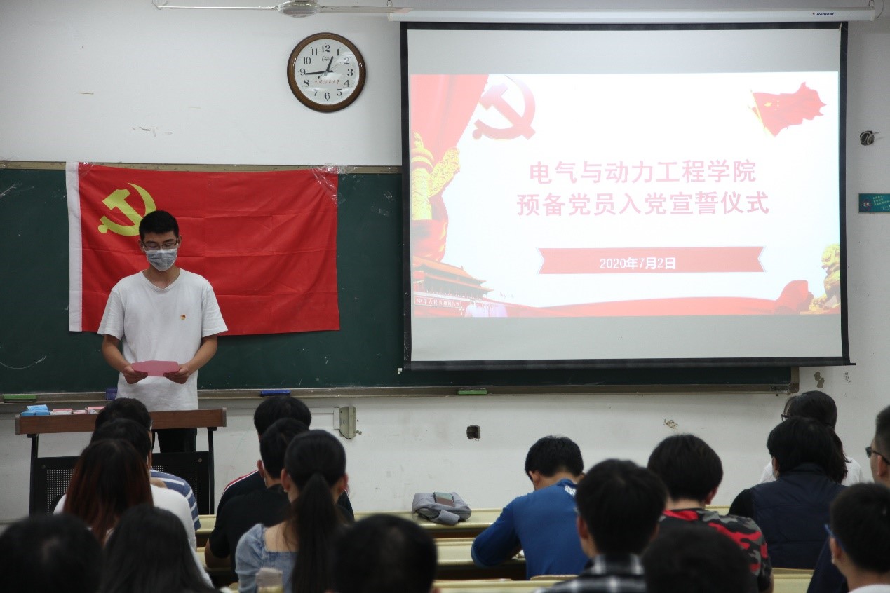 伴随着庄严肃穆、高亢激昂的国际歌,入党宣誓仪式正式开始。首先,新党员代表徐继远同学进行发言,他讲述了自参加党课培训以来,自己对党的认识与理解,在表达自己作为一名新党员的喜悦心情的同时也表现出自己为党奉献,为人民服务的决心。新党员代表发言结束后,老党员代表表示希望新党员加强理论学习,努力提高自己的思想觉悟,争做一名优秀的共产党员。
