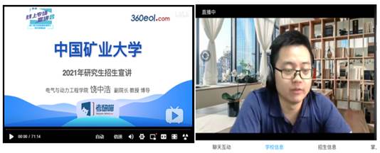 副院长饶中浩教授分别通过360教育在线和中国教育在线,进行了2021年研究生招生宣讲直播。饶中浩副院长分别从矿大简介、学科设置、师资队伍、科学研究、合作交流、近年情况、奖助政策和培养案例等九个方面,对做爱直播