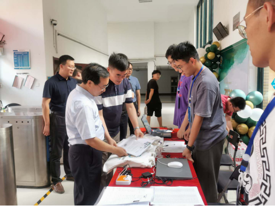松四迎新报到点指导检查迎新准备工作,慰问迎新工作志愿者。院党委书记伍小杰,党委副书记于基伯陪同检查。