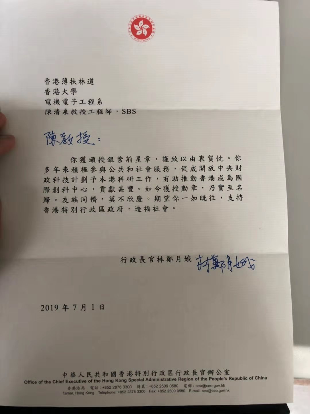 香港特区政府向陈清泉院士发来贺信