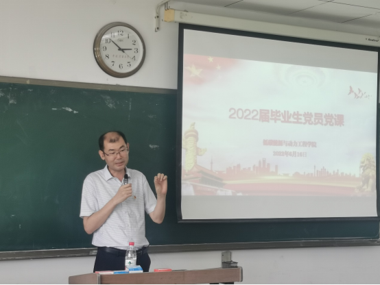 党委书记桑树勋在博四C304为全院毕业生党员讲授专题党课,党委副书记于基伯主持党课。