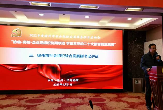 会议最后,徐州市社会组织综合党委副书记赵涛同志作总结发言,全面介绍了徐州市社会组织公益服务项目的设置初衷、发展历程和运营情况,希望高校、协会和企业党组织协同联动,整合链接三方资源,充分发挥党支部的战斗堡垒作用和党员的先锋模范作用,学宣贯党的二十大报告能源思想。