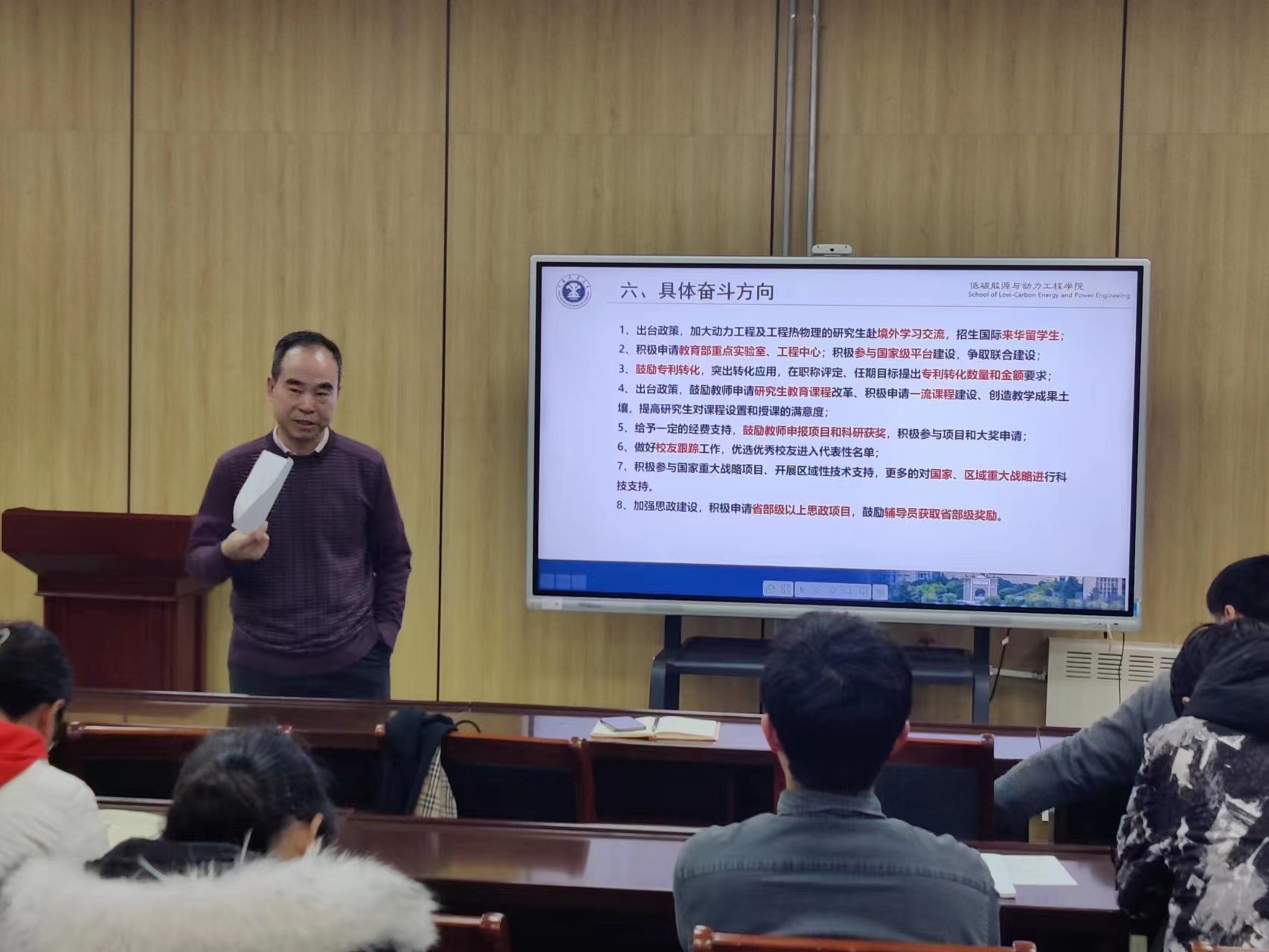 会议第二部分,张保生老师强调了下一步改进专业认证持续改进重点工作,探讨了能源与动力工程专业工程教育认证现场考查报告中专家提出的问题,指出下一步改进重点是培养方案、课程质量标准、试卷出题、试卷批改、合理性审核表、达成度报告的一致性,并强调了毕业设计完善工作。