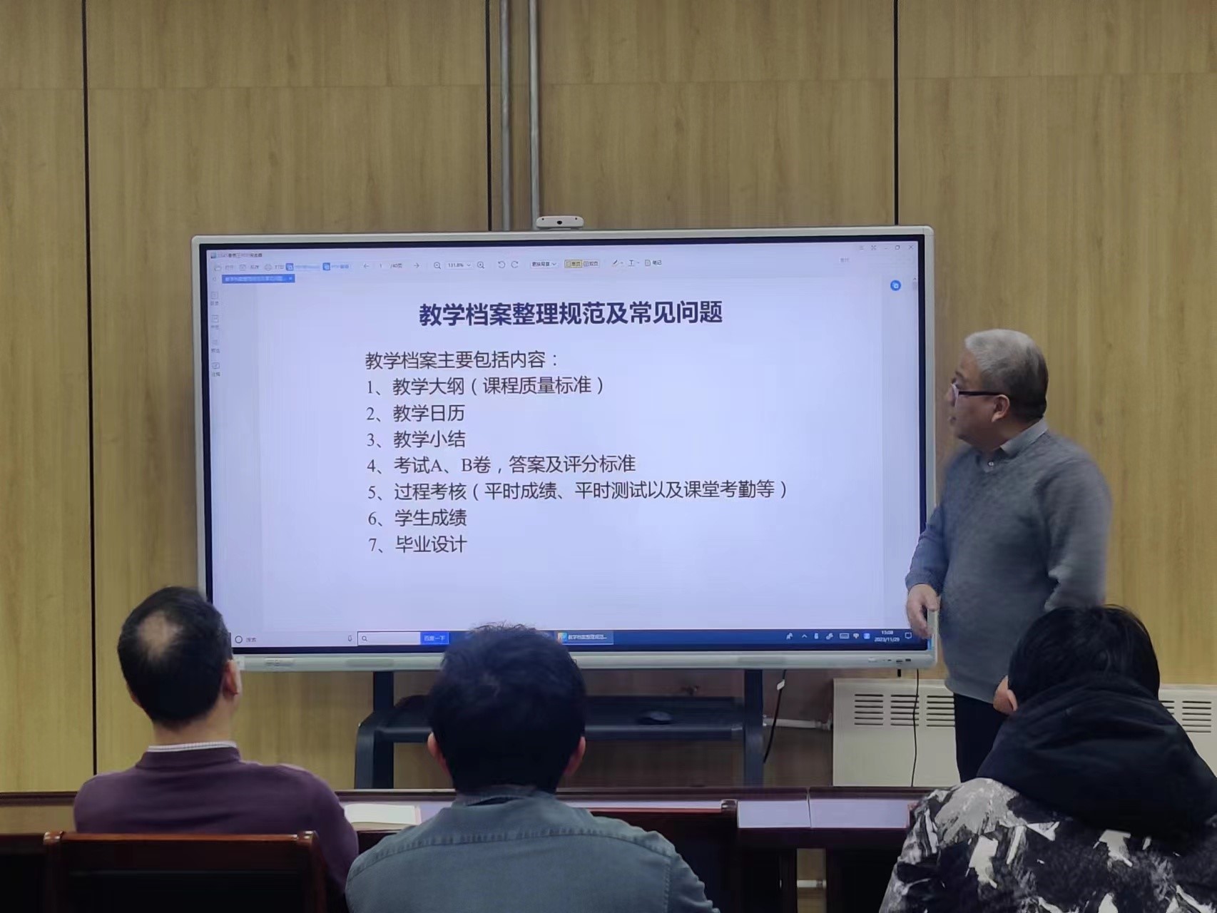 会议第四部分,韩东太老师介绍了教学档案规范化实操,针对教学大纲、教学日历、教学小结、考试答案及评分标准、过程考核、学生成绩和毕业设计方面,梳理了教学档案整理规范及常见问题。