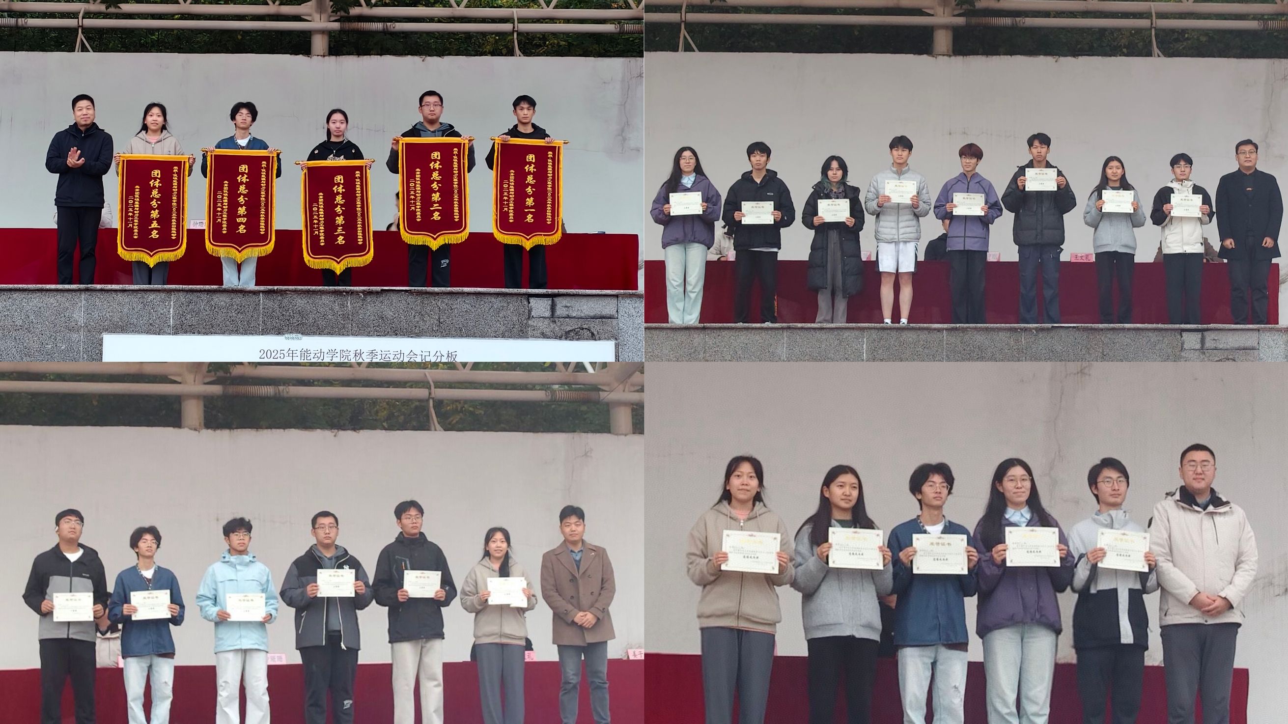 下午4时,运动会各项比赛圆满落幕,进行闭幕式。闭幕式开场是25级同学带来的创意十足的风采展示,各班级的展示节目或动感律动,或凝心造型,尽显青春朝气与班级凝聚力。奖项颁授环节中,能动25级8班、5班、7班、4班、9班获得团体总分前五名,能动25级2班、3班、4班、8班和9班获道德风尚奖,能动25级9班、5班、10班、2班、4班和6班获风采展示奖,能动24级4班、25级2班、4班、8班、5班、7班、9班和10班获接力项目奖项,25级4班、3班获混合项目奖项,党委书记王守刚和辅导员老师为他们颁发锦旗和奖状,见证班级的卓越实力。在欢快的音乐声中,运动会圆满落下帷幕。